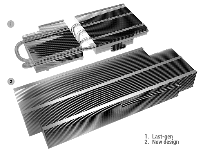 En esta generación, nuestras tarjetas de gama alta adoptan una huella de 2.7 ranuras para acomodar un disipador de calor más grande porque más grande es mejor. Hemos aumentado la superficie total de nuestra matriz de refrigeración en más del 50% en comparación con la última generación. Si deseas aprovechar al máximo rendimiento de la serie Dual GeForce RTX™ 2080 Ti, nuestro último diseño te ofrece mucho más espacio térmico para el overclocking. Si solo buscas una increíble experiencia plug-and-play, la disipación de calor extra mantiene a tus ventiladores funcionando a velocidades más bajas mientras juegas.
