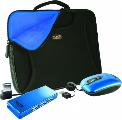 Perfect Choice Kit 3 en 1 para Netbook, Funda 10'' + Ratón + USB Hub, Negro/Azul