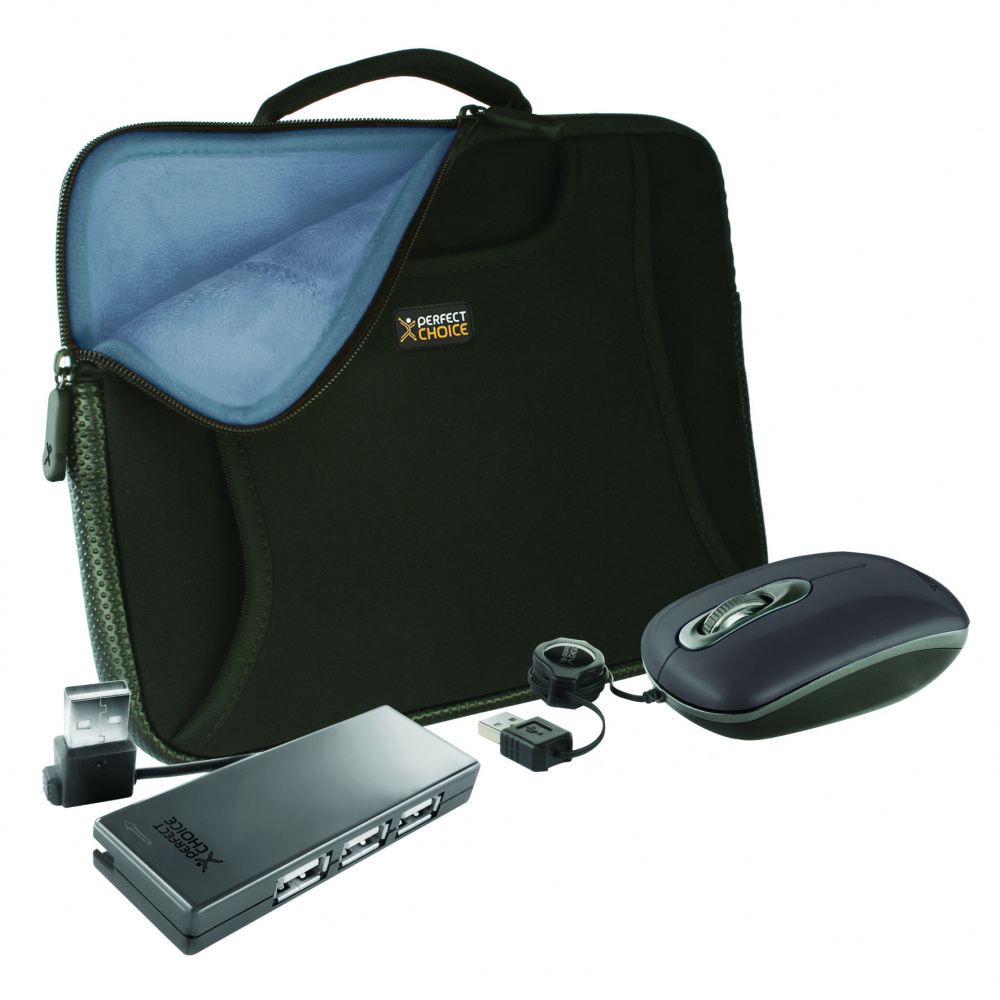 Perfect Choice Kit 3 en 1 para Netbook, Funda 10'' + Ratón + USB Hub, Negro/Gris