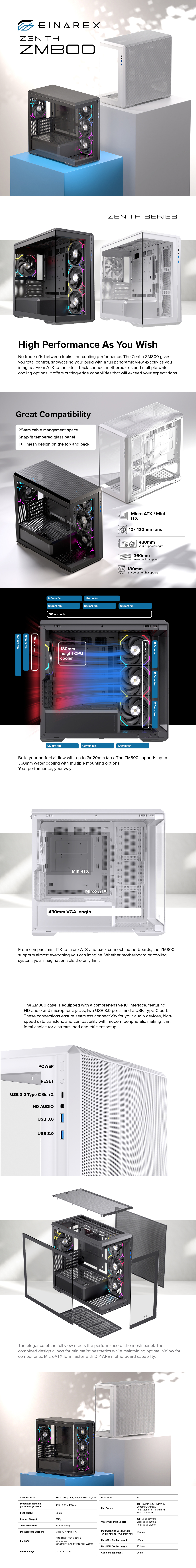 Gabinete Einarex Zenith ZM800 RGB, Midi-Tower, ATX/Micro-ATX/Mini-ITX, USB 3.0, sin Fuente, 4 Ventiladores Instalados, Blanco
