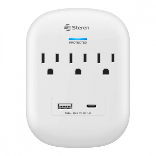 Steren Multicontacto de Pared 905-160, 3 Contactos, 1x USB, 1x USB-C, 125V, Blanco