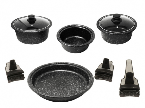 - Batería de 9 piezas desmontable de mármol negro antiadherente.
