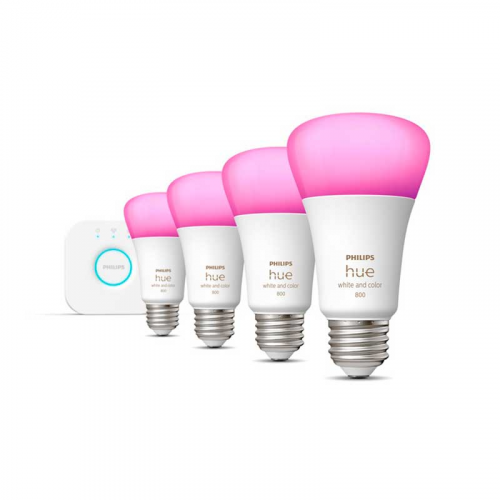 Phillips Kit Foco Regulable LED Inteligente Hue Starter Kit, WiFi, Luz Blanca/RGB, Base E27, 9.5W, 800 Lúmenes, Blanco - 4 Piezas