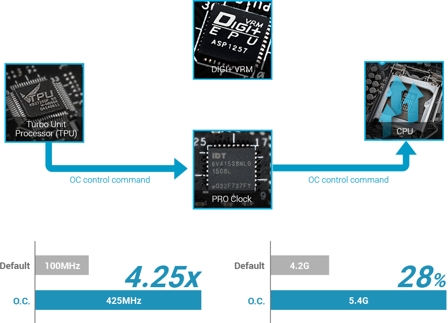 Un generador de reloj base (BCLK) diseñado para la 7ª generación de procesadores Intel® que permite acelerar las frecuencias de reloj base a más de 425 MHz*. Esta solución a medida trabaja junto a ASUS TurboV Processing Unit (TPU) para mejorar el control del OC del voltaje y el reloj base y llevar el rendimiento a cotas extremas.