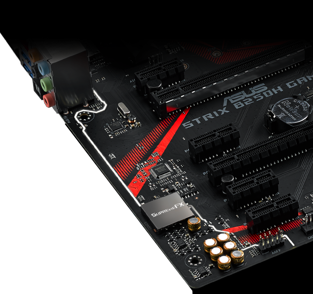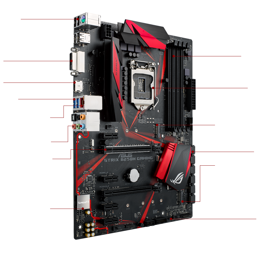La ROG Strix B250H Gaming hace gala de un atrevido diseño que presenta con orgullo la tradicional combinación rojinegra de ROG. En su cara superior, la placa de circuito de color negro mate está decorada con patrones bicolor inspirados en los cortes de una katana, así como los logotipos de ROG y Strix. El disipador de metal cepillado tiene una superficie angulada y detalles envejecidos que le confieren un aspecto agresivo y además reflejan la iluminación en diferentes ángulos. Y como no podía ser de otra forma, la tarjeta madre ROG Strix B250H Gaming ofrece un rendimiento tan extremo como su diseño.