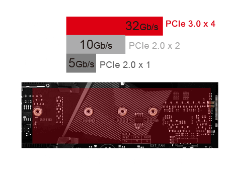 La ROG Strix B250H Gaming incluye dos ranuras M.2 con zócalo 3 y soporte M-Key. Una de las ranuras soporta los formatos de módulos NVMe PCIe 3.0 2242, 2260, 2280, 22110, y la otra soporta los modos SATA y PCIe 3.0 x 4. Juntas, representan la interfaz de M.2 más rápida y polivalente que existe.