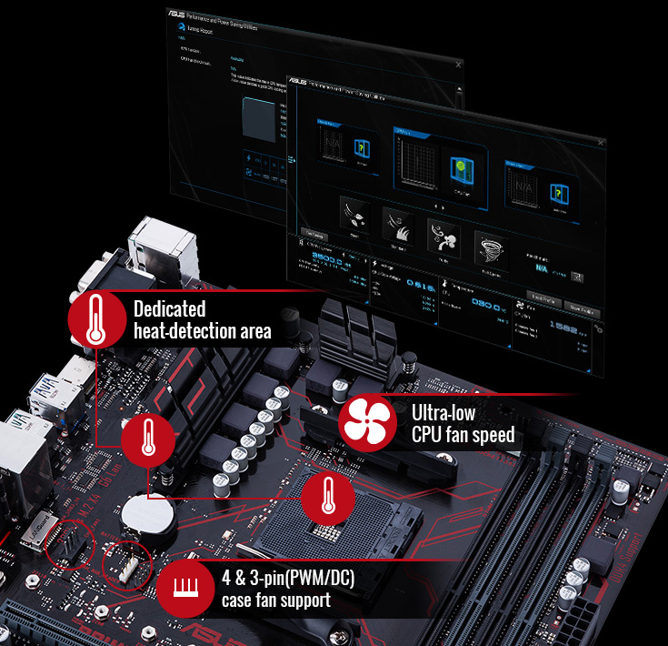 El exclusivo Fan Xpert asegura que cada ventilador consiga el balance entre rendimiento de enfriamiento y bajo nivel de ruido - y con las tarjeta de la Serie Prime B350 y su modo 4-pin/3-pin PWM/DC a nivel de hardware para ventiladores de carcasa, un simple ajuste en el BIOS te permite correr el ventilador de la carcasa en PWM/DC. Fan Xpert incluye el modo Auto-Tuning para escanear y detectar todas las características del ventilador con un sólo click.