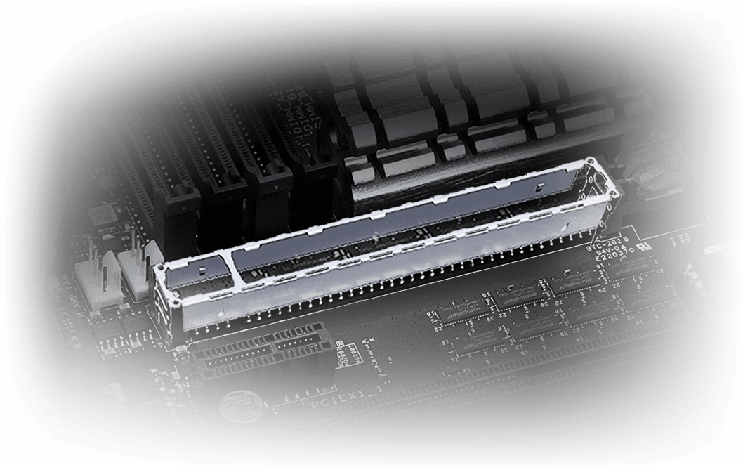 SafeSlot Core es la ranura PCIe exclusiva de ASUS. Con un diseño fortificado anclado a la tarjeta madre con un gancho especial, Safeslot Core provee una retención 1.6 veces mayor y 1.3 veces más resistencia de compartición que las ranuras de expansión estándar.