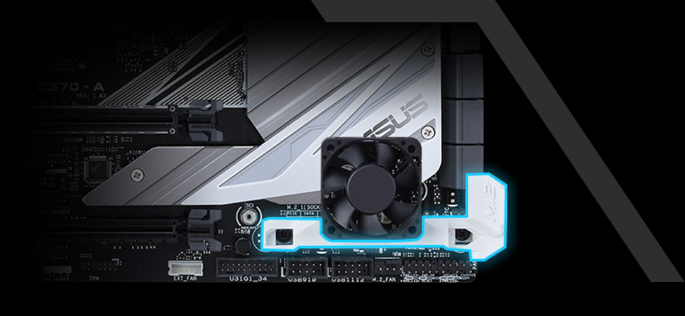 La ASUS Prime Z370-A incluye unos orificios de montaje pensados para instalar un soporte de ventilador M.2 compatible con ventiladores de 40 mm. Junto al disipado M.2, este diseño permite reducir las temperaturas de las unidades hasta 25°C para que tu almacenamiento trabaje a pleno rendimiento.
