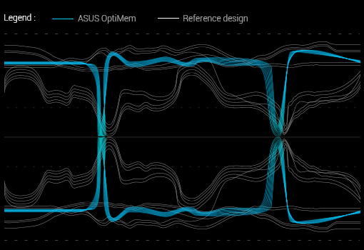 ASUS OptiMem preserva la integridad de las pistas que transmiten la señal de la memoria transmitiéndolas por la capa más indicada del PCB. El diseño ASUS T-Topology transmite las señales de forma alineada y reduce la distancia entre los módulos de memoria, lo que resulta en un mayor rango disponible para operaciones de overclocking y en una estabilidad superior con la que se puede alcanzar velocidades DDR4 de hasta 4000 MHz con todos los módulos ocupados.