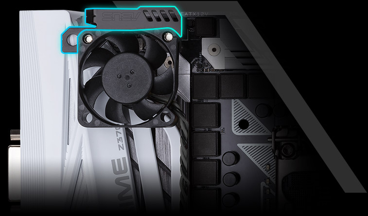 Con el nuevo soporte de ventilador de ASUS puedes aumentar la ventilación del área VRM de forma sencilla. Atornilla un ventilador de 40/50 mm, monta el soporte en el disipador, conecta el ventilador y podrás reducir la temperatura de la zona VRM hasta 25 grados, algo ideal para operaciones de overclocking.