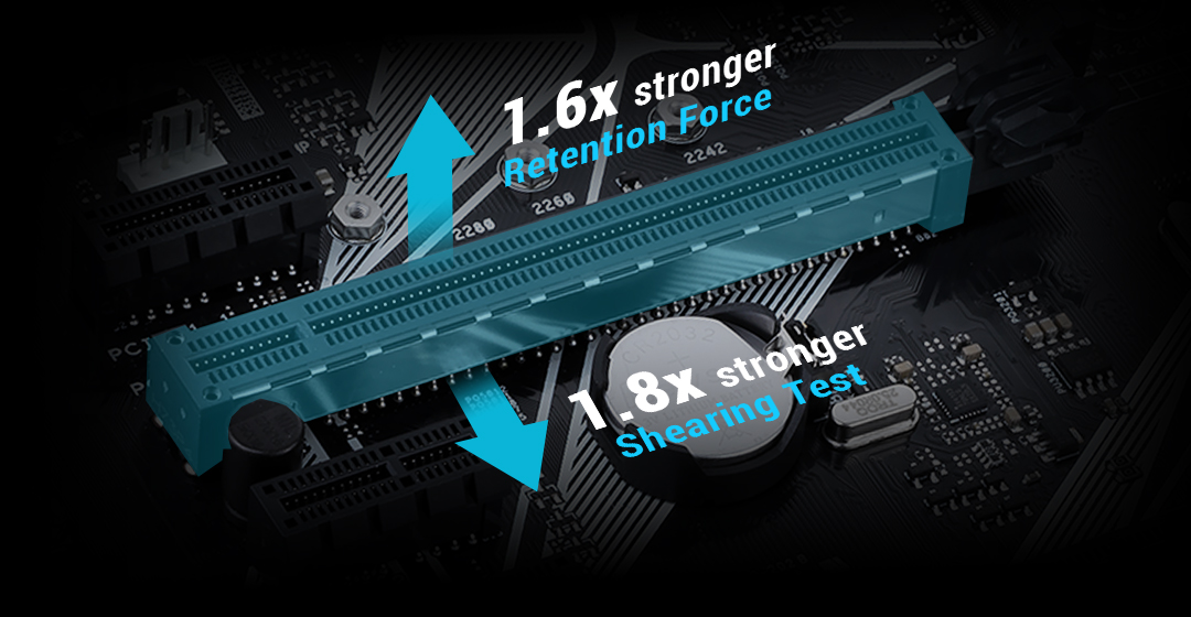 *Tarjeta ThunderboltEX 3 no incluida.SafeSlot es un nuevo diseño de ranura PCI Express creado por ASUS que proporciona una mayor fuerza de retención y resistencia transversal. Fabricado mediante el moldeado por inserción, SafeSlot integra la ranura con metal reforzado, lo que resulta en un conector más resistente que se ancla al PCB mediante unos puntos de soldadura adicionales.