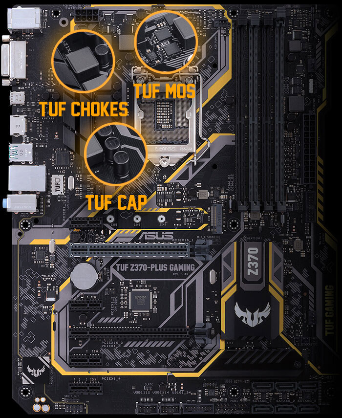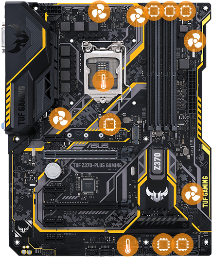 Las tarjetas madre TUF Gaming están diseñadas para ser fuertes y confiables. TUF Protection es el nombre de las salvaguardas de hardware de TUF Z370-Plus Gaming que garantizan durabilidad y estabilidad a largo plazo, mientras que los complementos de TUF de grado militar se fabrican y prueban con los estándares exigentes - proporcionando la confianza que necesita para crear un sistema de juego que va más allá.