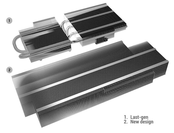 En esta generación, nuestras tarjetas de gama alta adoptan una huella de 2.7 ranuras para acomodar un disipador de calor más grande porque más grande es mejor. Hemos aumentado la superficie total de nuestra matriz de refrigeración en más del 50% en comparación con la última generación. Si deseas aprovechar al máximo rendimiento de la serie Dual GeForce RTX™ 2080 Ti, nuestro último diseño te ofrece mucho más espacio térmico para el overclocking. Si solo buscas una increíble experiencia plug-and-play, la disipación de calor extra mantiene a tus ventiladores funcionando a velocidades más bajas mientras juegas.