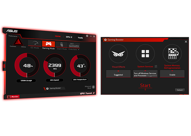 La utilidad ASUS GPU Tweak II lleva la optimización del rendimiento de la tarjeta de video al siguiente nivel. Te permite ajustar parámetros críticos, incluidos los relojes centrales de la GPU, la frecuencia de la memoria, la configuración de voltaje y más, con la opción de monitorear todo en tiempo real a través de una visualización en pantalla personalizable. Desde el ajuste de rendimiento hasta el control avanzado del ventilador, GPU Tweak II tiene todas las herramientas que necesitas para sacarle el máximo rendimiento a tu tarjeta de video.